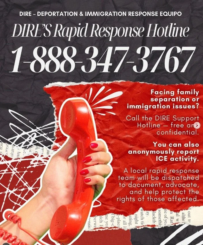 If ICE is at your door, your car, place of work, or you see them in your neighborhood, immediately call the DIRE hotline 888-347-3767 (888-DIRE-SOS). The DIRE hotline is staffed with bi-lingual operators who will take your information and offer support during or after an immigration enforcement action.